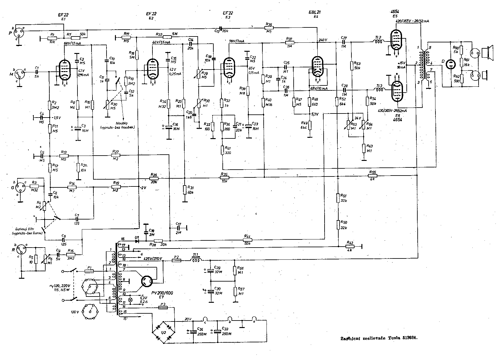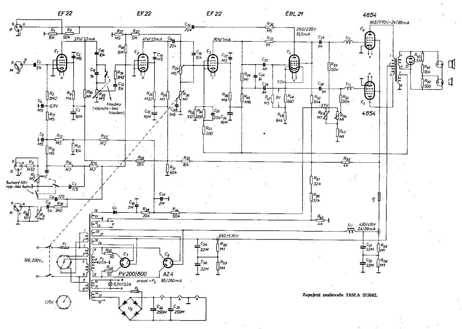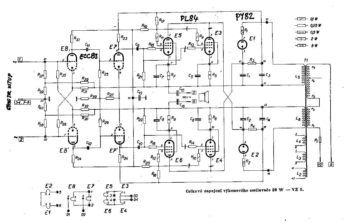 Zesilovač KZ25 - 513034 (r.v.1954) Zesilovač KZ50 - 513042 (r.v.1958) Zesilovač VZ2 (Williamsonův) (r.v.1957) Rozhlasová ústředna 75W pro 100V rozvod: blok předzesilovače pro mikrofon blok předzesilovače pro gramofon mixážní blok blok korekčního předzesilovače blok příposlechového zesilovače blok indikátoru vybuzení blok koncového stupně 75W blok zdroje pro koncový stupeň AKZ400-"Music 40" Transiwatt TW40 stereo