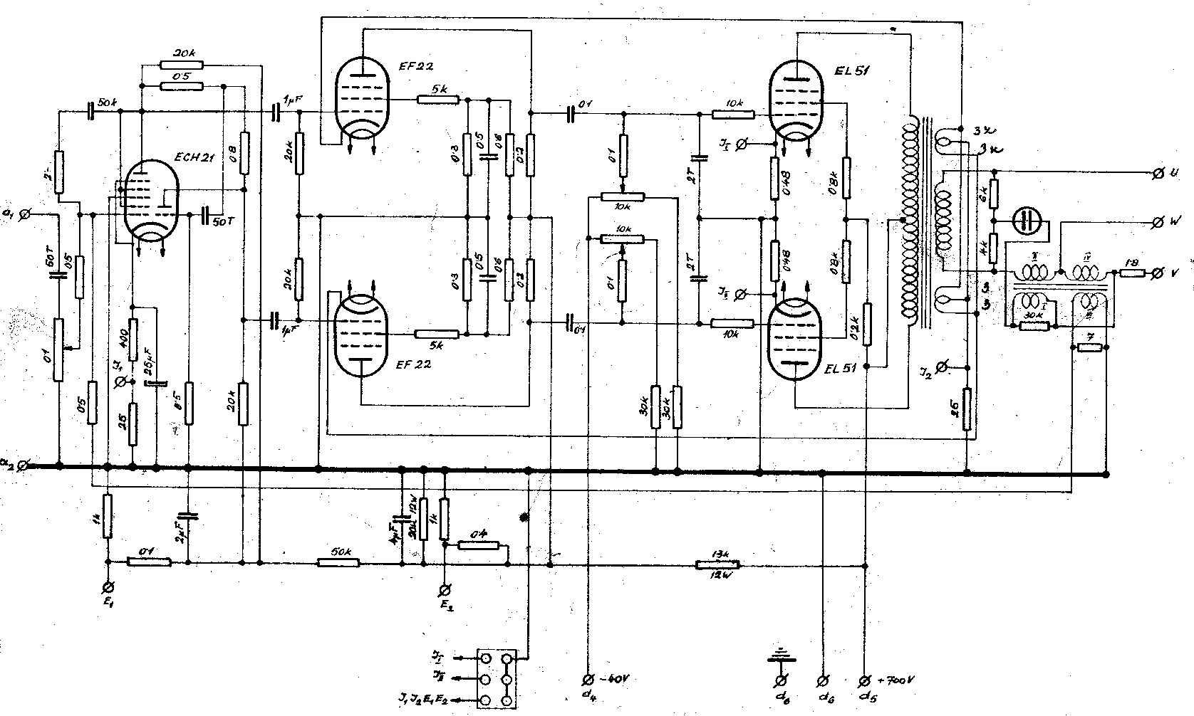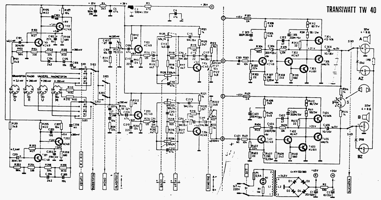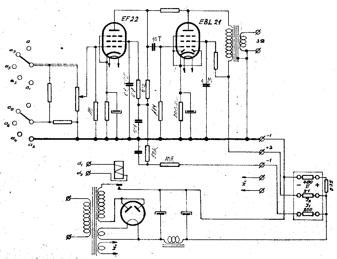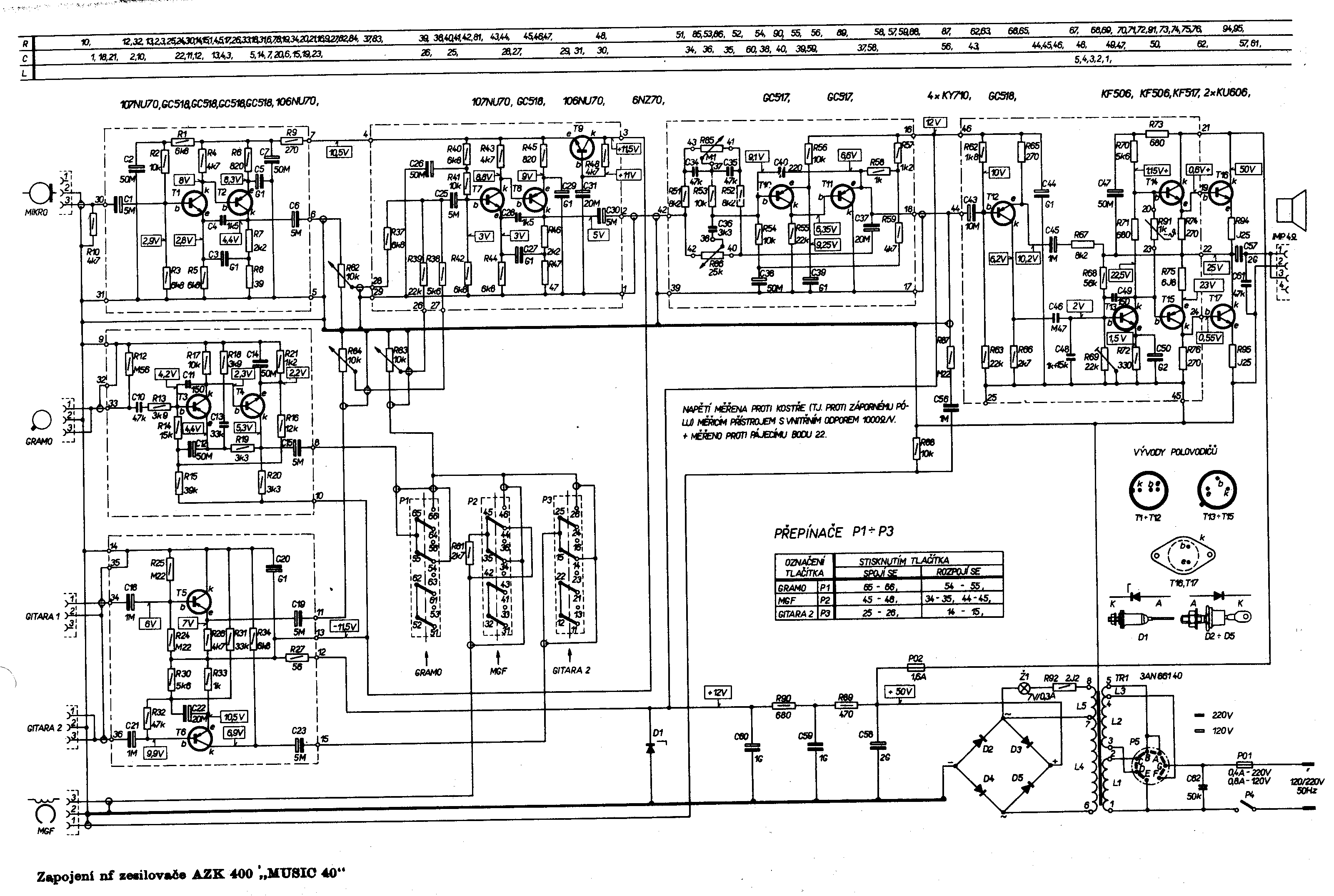 Zesilovač KZ25 - 513034 (r.v.1954) Zesilovač KZ50 - 513042 (r.v.1958) Zesilovač VZ2 (Williamsonův) (r.v.1957) Rozhlasová ústředna 75W pro 100V rozvod: blok předzesilovače pro mikrofon blok předzesilovače pro gramofon mixážní blok blok korekčního předzesilovače blok příposlechového zesilovače blok indikátoru vybuzení blok koncového stupně 75W blok zdroje pro koncový stupeň AKZ400-"Music 40" Transiwatt TW40 stereo